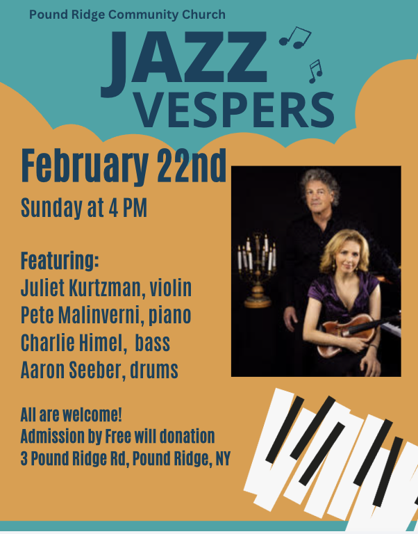 The Jazz Vespers at Pound Ridge Community Church is a unique and uplifting musical service that blends the soulful rhythms of jazz . Join us for an inspiring evening where talented musicians create an atmosphere of spiritual rejuvenation through dynamic jazz performances.