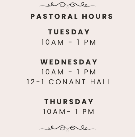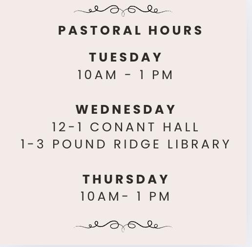 If you are in need of pastoral care, please call the church office at 914-764-9000 to make an appointment. You may also contact Pastor Cho directly by email at pastor@poundridgecommunitychurch.org. Pastor Cho, aka “e-Dayfly” can meet with you during his office hours (below) or at a scheduled time. He can also be reached at his direct number: 914 319 4241.