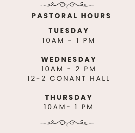 If you are in need of pastoral care, please call the church office at 914-764-9000 to make an appointment. You may also contact Pastor Cho directly by email at pastor@poundridgecommunitychurch.org. Pastor Cho, aka “e-Dayfly” can meet with you during his office hours (below) or at a scheduled time. He can also be reached at his direct number: 914 319 4241.